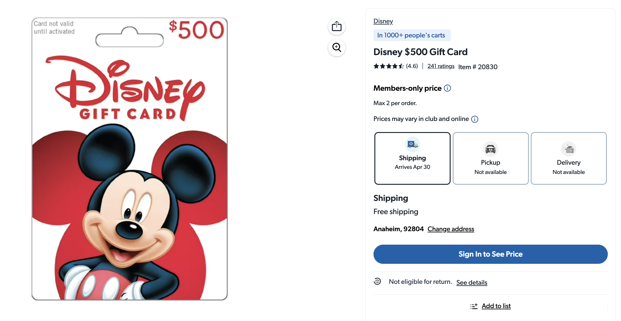 Again, the deal is not yet live, so you won’t see the $450 price. The $500 Disney eGift Card for $450 will be available online at Sam’s Club from May 1-3, 2026.