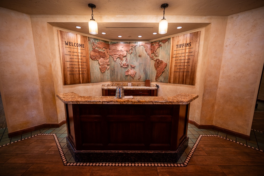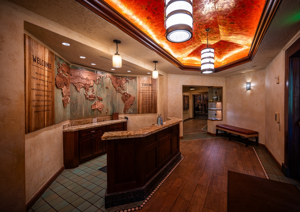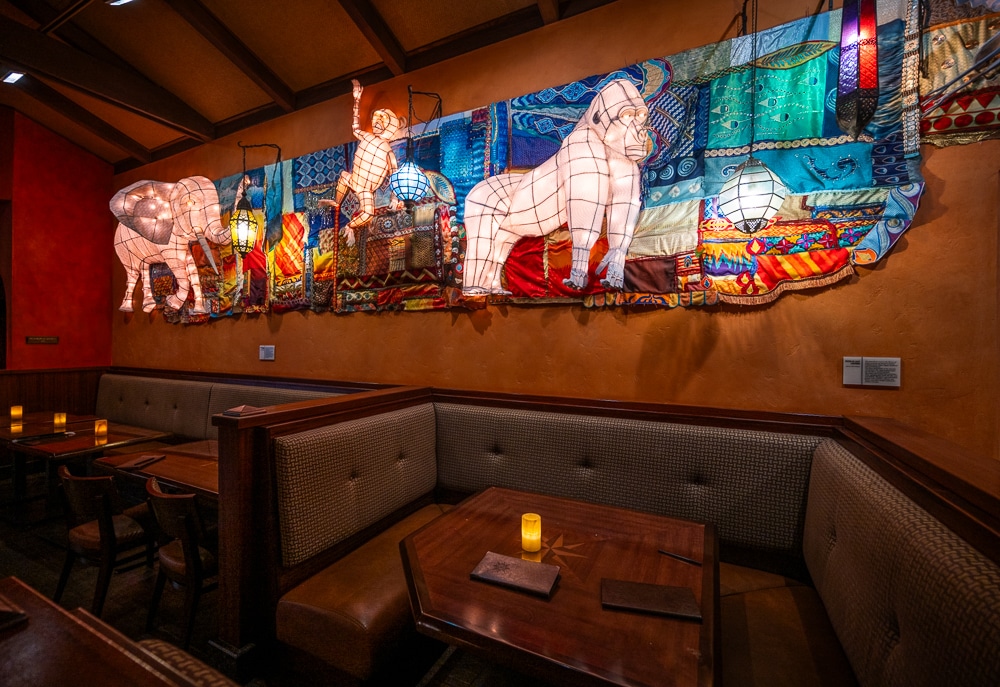 Walt Disney World describes dining inside Tiffins Restaurant as being like sharing a meal “inside a renowned adventurers’ club” (lower case letters) in that the theme of travel can be seen and felt everywhere you look. Hike your way through the rustic front doors and behold an enormous map of the globe, leading to 3 elegant dining rooms honoring the spirit of Africa, Asia and some of the world’s most exotic animals.