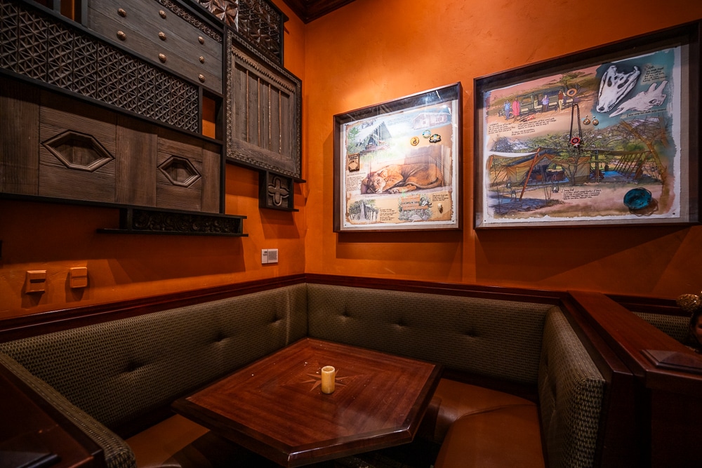 Unless they’re blocked off, it’s worth exploring the other dining rooms (no matter where you’re seated). There’s artwork throughout, including photograph collages, paintings, sculptures, actual notes and field sketches of the Imagineers who brought Animal Kingdom to life.